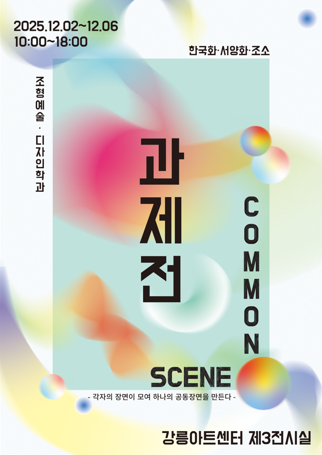 올 한 해 동안 우리 학과 1·2·3학년 학생들은 각자의 시선과 개성을 바탕으로 꾸준히 탐구하고 실험하며 자신만의 창작 세계를 확장해 왔습니다.이번 2025 조형예술·디자인 전 -  COMMON SCENE는 그 과정에서 탄생한 다양한 작품들을 한자리에서 만나볼 수 있는 자리입니다.