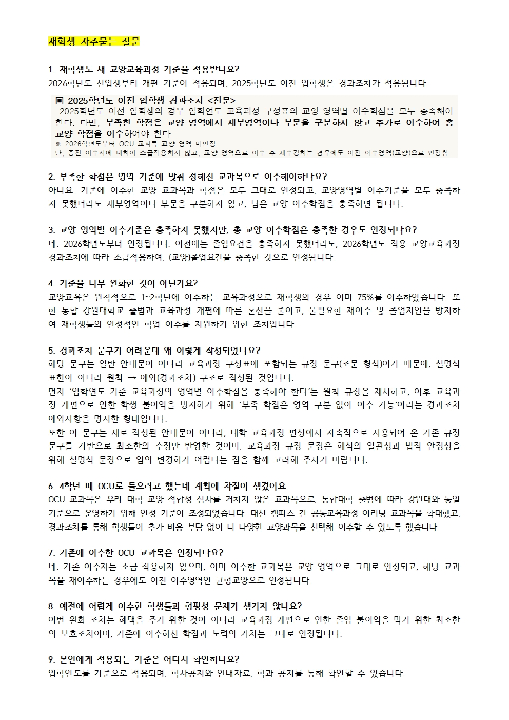 2026학년도 교양교육과정 개편 : 경과조치 관련 FAQ