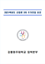 2026학년도 추가모집요강 1차 추가 원서접수 : 2026.2.20.(금)10:00~2.25(수)10:00까지 2차 추가 원서접수 : 2026.2.25.(수)16:00~2.26.(목)14:00까지 접수방법 : 인터넷 원서접수 * 3차 추가모집은 1차 및 2차 추가모집 미충원 시 실시 예정 바로보기 다운로드 Kangwon National University 2026 Kangwon National University 2025 2025학년도 신입생 1차 추가모집 요강 바로보기 다운로드 Kangwon National University 2024 2024학년도 신입생 1차 추가모집 요강 바로보기 다운로드 Kangwon National University 2023 2023학년도 신입생 1차 추가모집 요강 바로보기 다운로드 Kangwon National University 2022 2022학년도 신입생 1차 추가모집 요강 바로보기 다운로드 Kangwon National University 2021 2021학년도 신입생 1차 추가모집 요강 바로보기 다운로드 Kangwon National University 2021 2021학년도 신입생 2차 추가모집 요강 바로보기 다운로드 Kangwon National University 2021 2021학년도 신입생 3차 추가모집 요강 바로보기 다운로드
