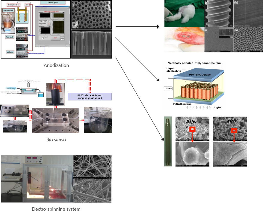 - TiO2 nanotube 및 nanofiber를 통해 염료감응형 태양전지, 수처리를 위한 분리막, 임플란트등 다양한 분야에 응용연구